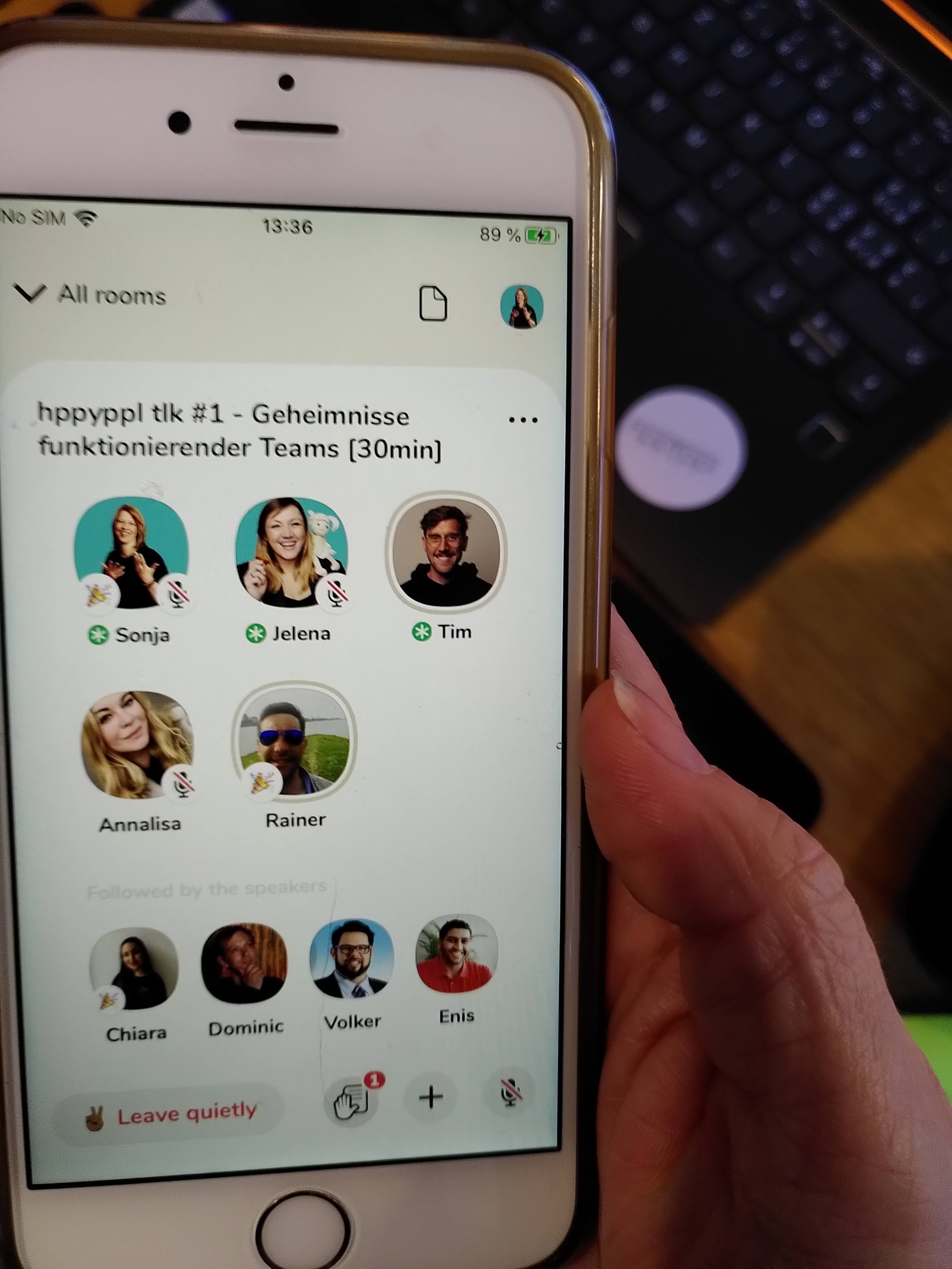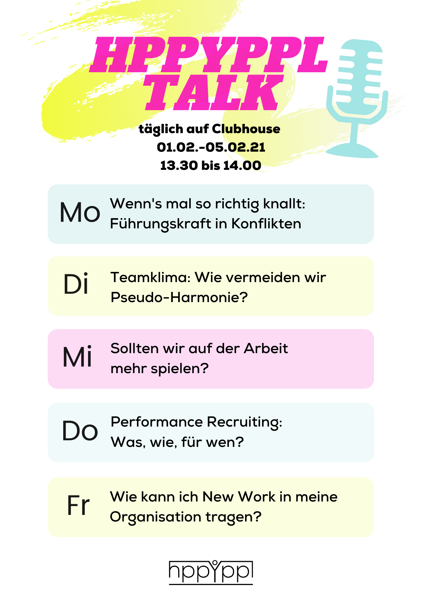There are also other hppyppl-driven formats like a Fuck-Up night or a session in which companies can pitch their open positions and themselves as employers to potential candidates. Clubhouse has been an interesting experience so far. We have anywhere between 20 and several hundred people joining the sessions. I doubt if that would be possible at such short notice and so easily on other channels. The setup is like a fishbowl format but only audio; there are a couple of people “on stage” and anyone can raise their hand to join the discussion if the speakers permit. A little bit like a live-podcast that you can hop into. I know that the platform is being discussed quite controverially and I see the downsides, but I have the impression that the opportunities and benefits outweigh the negatives. What I like about Clubhouse is that it’s audio-only, so you can really focus on what is said. Anyone can host conversation rooms. There is a bit of a pecking order around the number of followers as you would expect, so people are more likely to join rooms hosted by people with lots of followers, but I very often see sessions in which newbies get equal airtime to experienced speakers and we also try to practice that in the formats that we host.