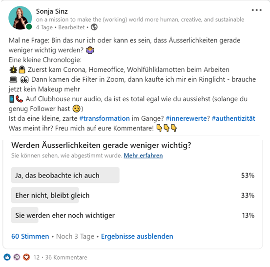 I posted a survey on LinkdIn the other day about whether appearances in general are becoming less important. A bit over halft the people say they sahre this impression. During the first lockdown, we learned to work in comfy clothes. With filters in Zoom and a good ringlight I have noticed that I don’t need to put on make-up anymore. On Clubhouse it’s audio-only. So might it be that there is a subtle transformation underway? Might we be becoming less superficial?