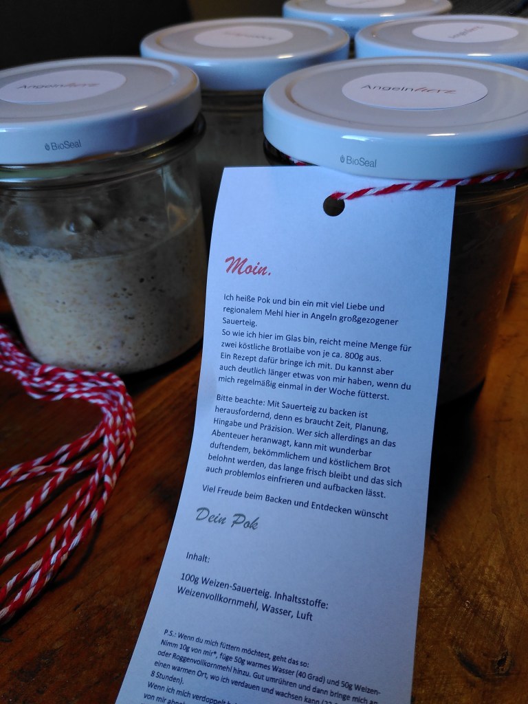 Speaking of experiments and regional engagements, of course I need to mention that my sourdough is getting some attention at the moment. My “gardener” Markus who also sells flour and eggs at a local market, has asked me if I would like to try and see how my sourdough that I have been baking with now for a couple of months works as a product. That re-kindled the marketer in me. I got to work in multiplying the sourdough, coming up with a product design and two tailormade recipes to go with it. I am quite proud of the result. Imagine, on the first day all 18 pots were sold out completely. It’s funny to think that my sourdough might be helping produce delicious bread now all across the region right now.